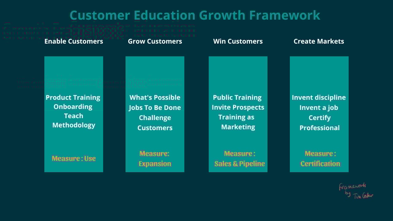 The customer education growth framework is a tool for designing a customer education strategy that aligns with the growth priorities of your company. It also gives you a means how to communicate your strategy to your executive team when they ask, "What else can we do to grow our business?"
