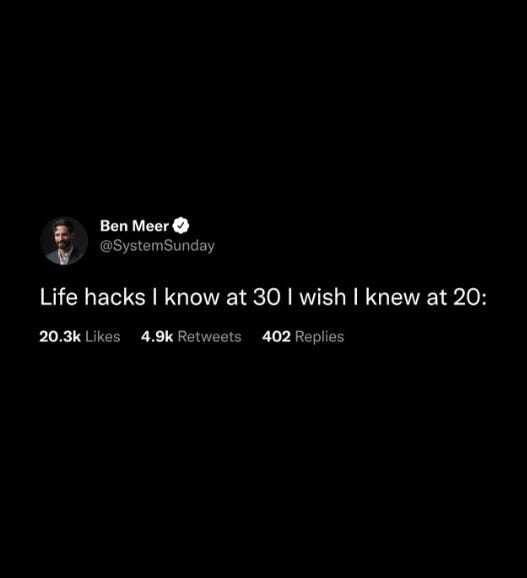 Ben Meer shares 30 lifehacks that you should know in your 20s. Some great ones and hope they can help you become a better version of yourself.