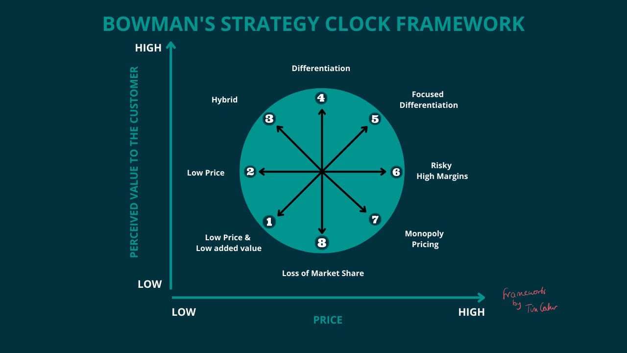 Bowman’s Strategy Clock framework is a deeper take on Porter’s 5 forces focusing on the competitive edge of a company. This framework will help you position yourself in the market based on the perceived value and pricing by the market. There are 8 positions in the clock below, each showing a different strategy to succeed in the market.