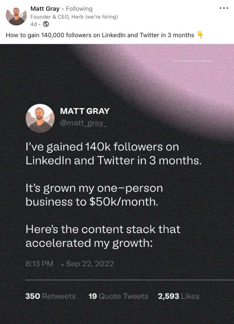 Matt Gray provides actionable insights into how he grew 140,000 followers on LinkedIn & Twitter in 3 months. This is a great example of content creation as a tool to speed up growth rather than holding you back. You can read the post here