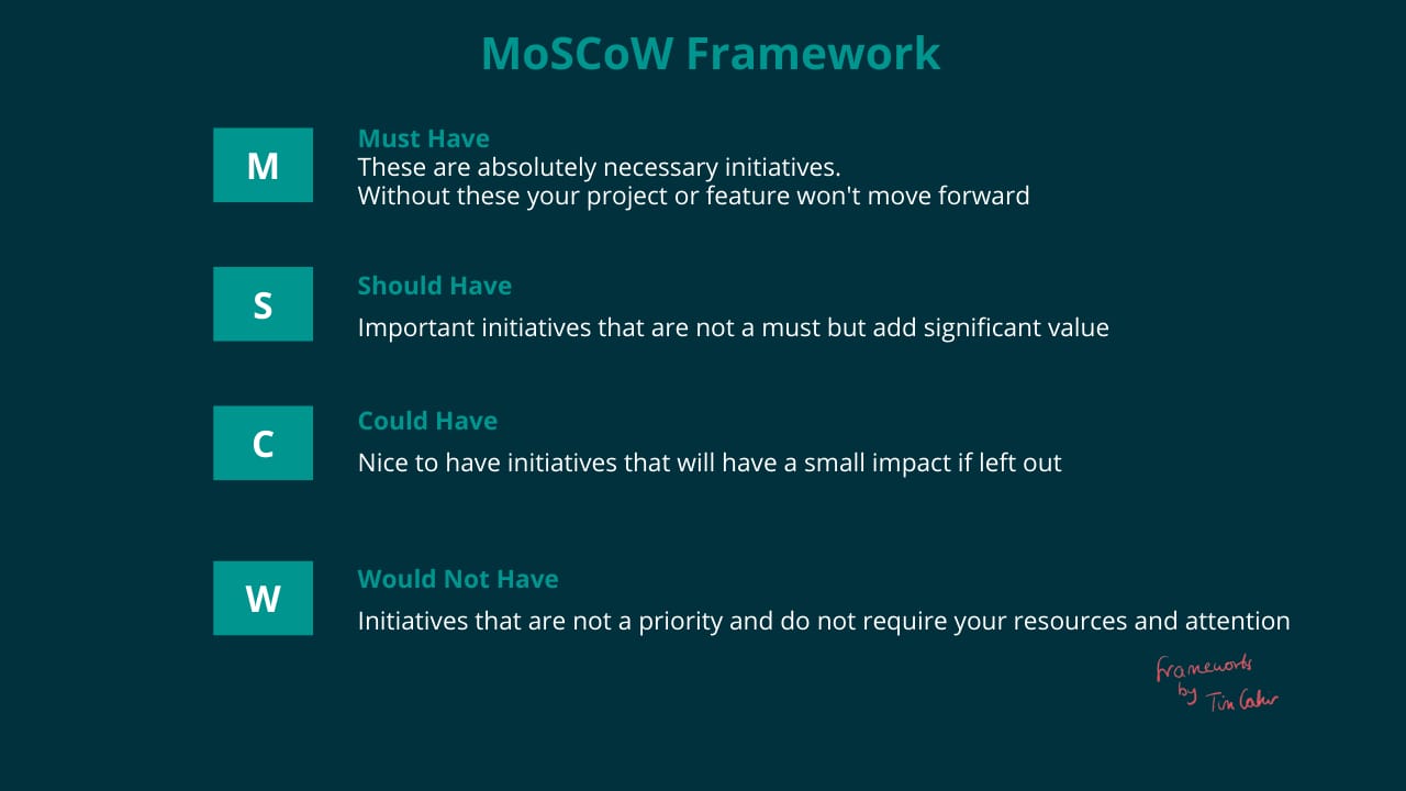 MoSCow is a prioritisation framework for managing project requirements. It’s one of the simplest methods to evaluate the relative importance of each task. MoSCow should ideally be used in the early phase of a company that doesn’t require significant technical input.