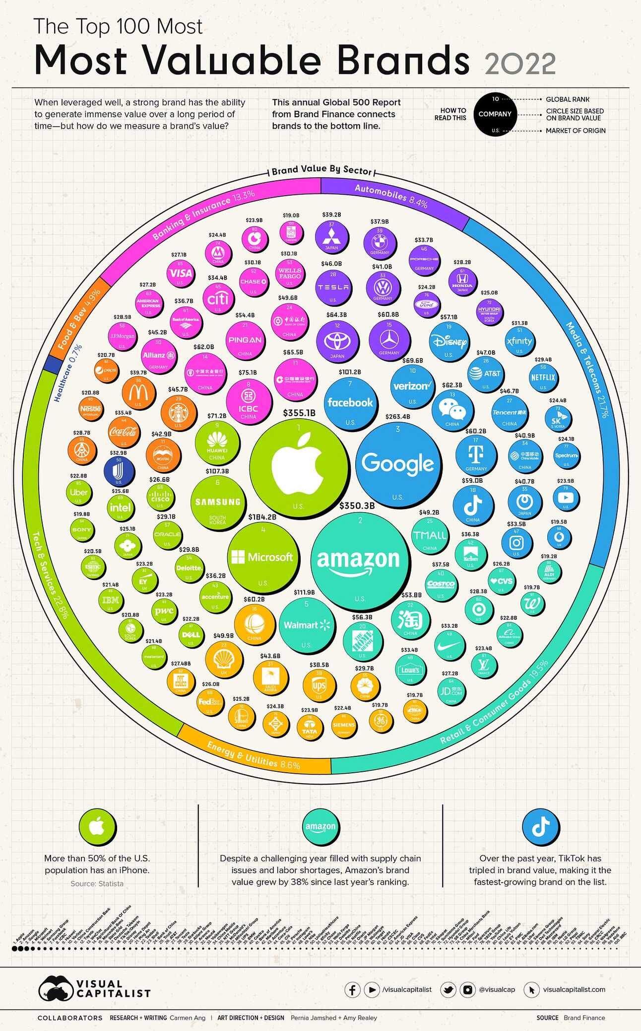 Here are the top 100 most valuable brands in 2022. US and China account for 73 of the 100 brands (50 & 23 respectively) whereas European countries make up 14% of the list.