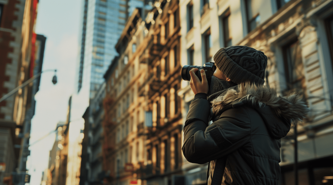 Prompt: A young photographer outdoors on the streets of New York, capturing the architectural design of a vintage building, early morning with clear weather. The specific morning light casts sharp, long shadows, emphasizing the contours and features of the building. The action unfolds in a documentary photography style, utilizing a vibrant color scheme, Leica M10-R camera, Middle shot at eye level. The setting is contemporary --ar 16:9