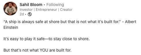 Playing safe is a temptation that convinces us that we are doing the right thing. Wrong. Experiment, test your ideas, and create something by being uncomfortable. It is purpose and drive that will take you above and beyond your set expectations.