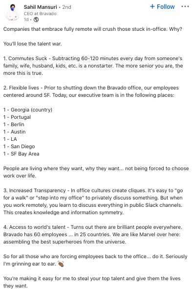 With talent war capturing attention and remote work gaining traction, here’s a great post by the CEO of Bravado, focusing on the benefits of companies hiring remote talent. This may not be applicable to all industries but companies will tend to lose out on talent if remote work is not an option at all.