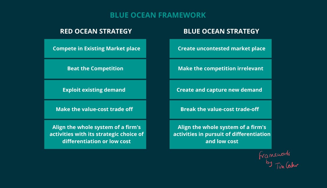 The Blue Ocean framework creates differentiation for a product or finds a new market that was uncontested. Blue ocean markets are high growth and profitable compared to the red ocean markets. An example of a company using the blue ocean framework was Netflix:Netflix was competing with the DVD sales & rental industry in 1997. Netflix pivoted to selling movies & shows online by taking advantage of the internet. They also created a personalized subscription for people to choose multiple movies based on their previous views. When its competitors started copying them, Netflix moved to create its own content.