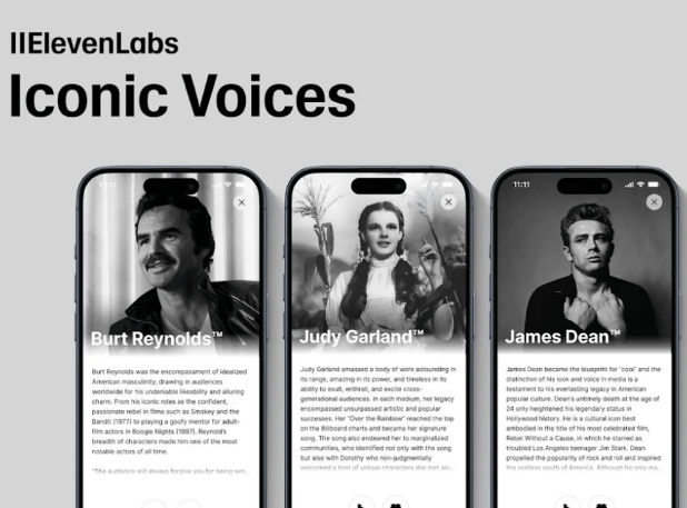 ElevenLabs has launched their new "iconic voices feature" in their Reader App, featuring the voices of Judy Garland, James Dean, Burt Reynolds, and Sir Laurence Olivier. This is made possible through partnerships with the estates of these legendary artists.